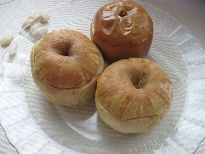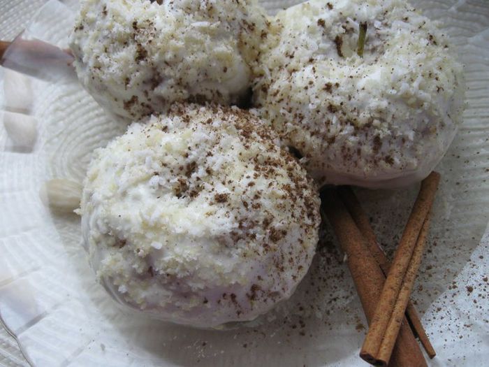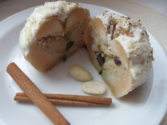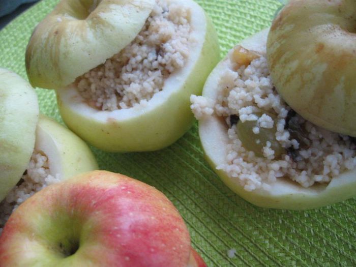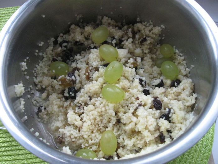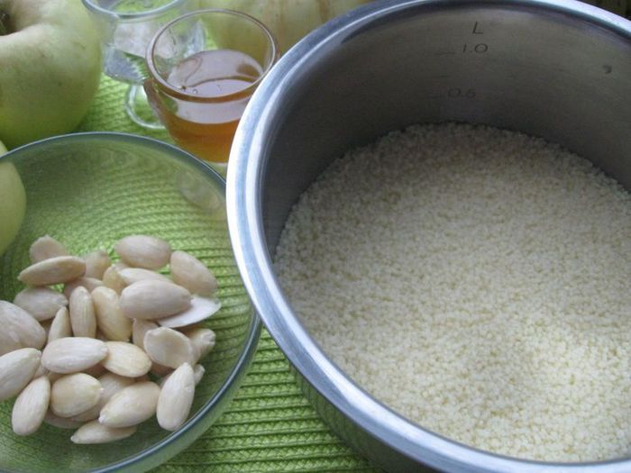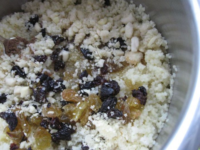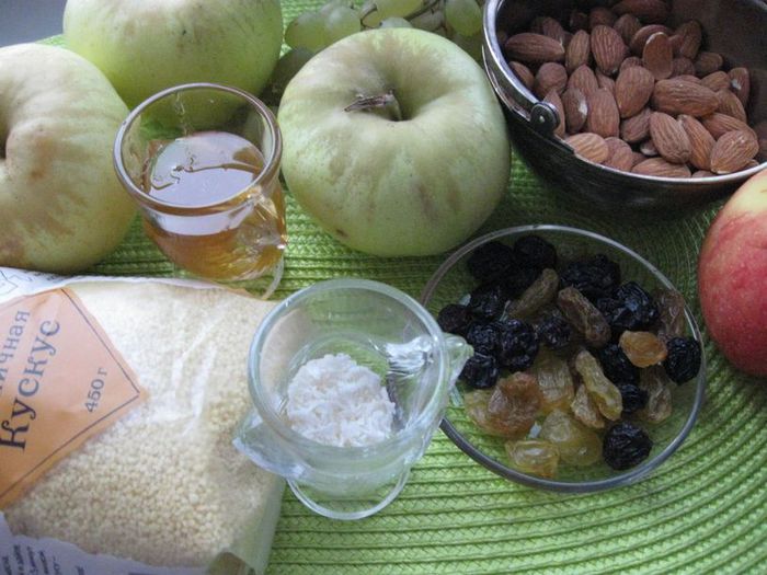 Миндаль залить кипятком на 5 минут. Слить воду, очистить от шелухи. Измельчить, разделить на 2 части. Большая будет использована в начинке, меньшая - для посыпки готового блюда. Кокосовую стружку измельчить. Изюм порезать. Кус-кус залить кипятком (1 стакан) и дать настояться 15 минут.