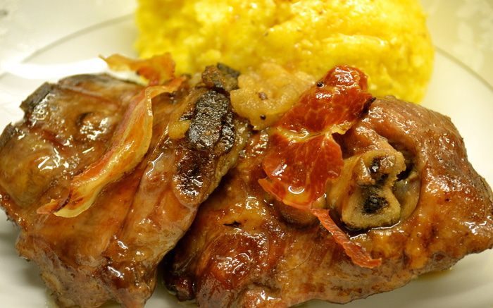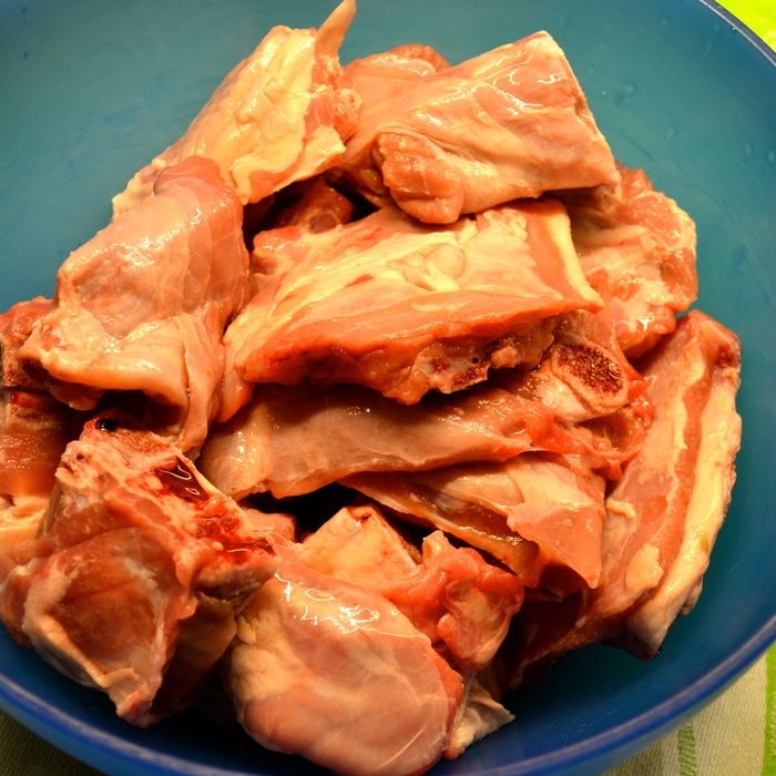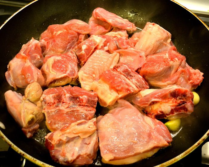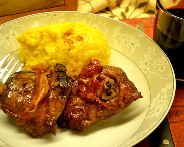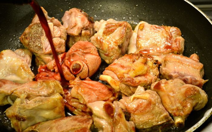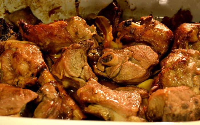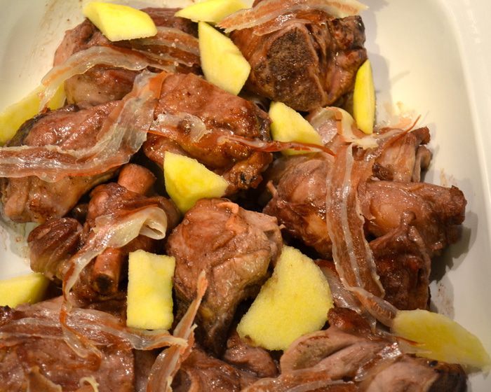 Переложить кусочки мяса в форму, которую можно поставить в духовку. Полить образовавшимся соусом со сковороды. Выложить на козлика полосочки бекона и положить в свободном порядке кусочки яблока. Поставить форму в духовку на нижний уровень (чтобы мясо слишком не подсохло сверху).