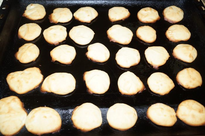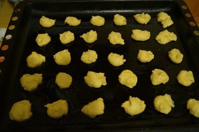 Ложкой или поварским пакетом выкладываем порционное печенье на противень, смазанный маслом или застеленный бумагой для выпечки.