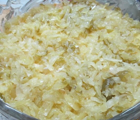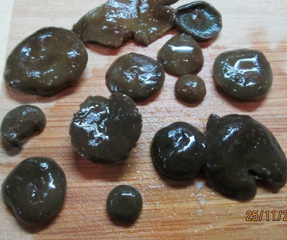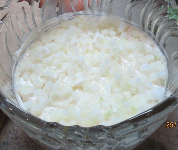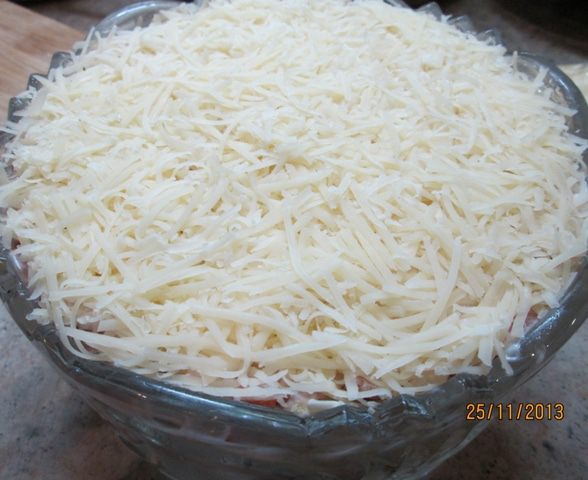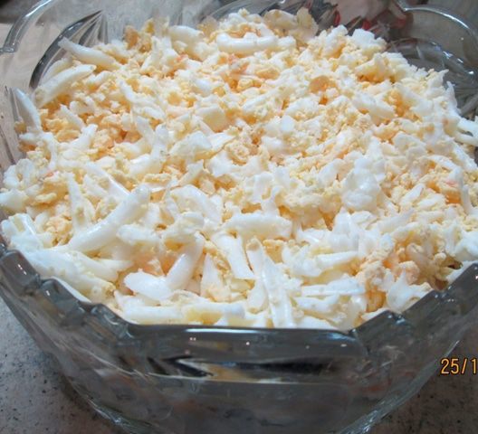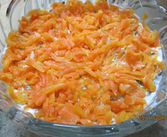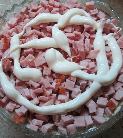 Грибы (соленые, а не жаренные и не маринованные!) измельчаем – и в салат! У меня были рыжики. Муж собирал. Такие крохи попадались! Их, конечно, не крошила. Вообще, солить рыжики – еще та работа! Чтобы не убить смолистый вкус рыжика, мы его очищали щеткой, без воды, от песка и хвоинок, пересыпали солью – и под гнет, на холод! Они обильно дают сок, который и распределяет соль равномерно. И никаких приправ! Я отвлеклась! На слой грибов – снова майонез.