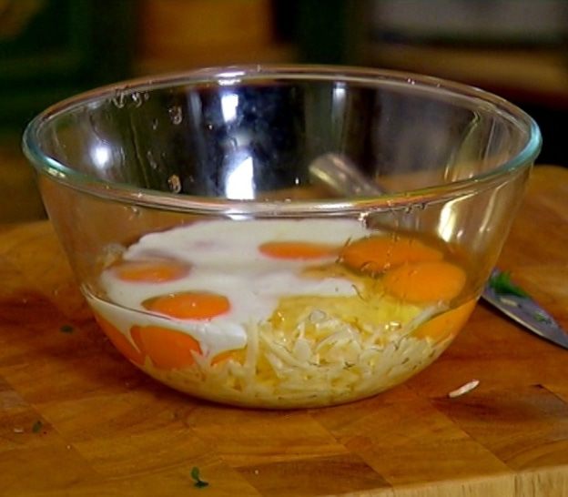 Яйца соединить с натертым сыром, влить молоко, посолить, поперчить и перемешать.