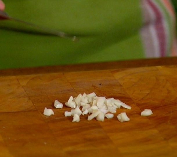 Чеснок почистить, раздавить плоской стороной ножа и мелко порубить.