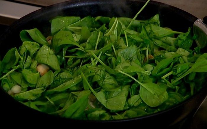 Добавить зеленый лук и шпинат, еще немного обжарить, затем уменьшить огонь и готовить 2–3 минуты, чтобы шпинат стал мягким.