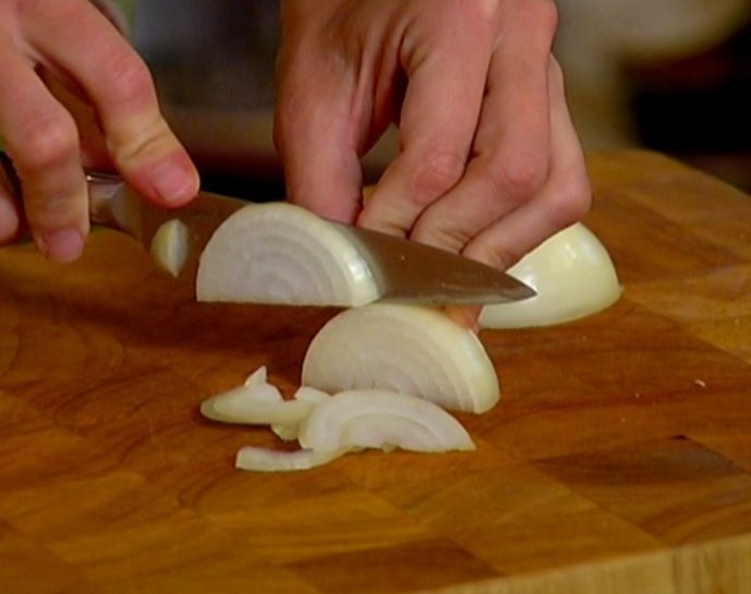Лук почистить и нарезать полукольцами.