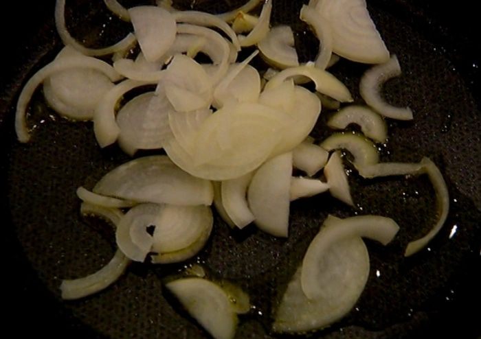 Разогреть в сковороде оливковое масло и обжарить лук.