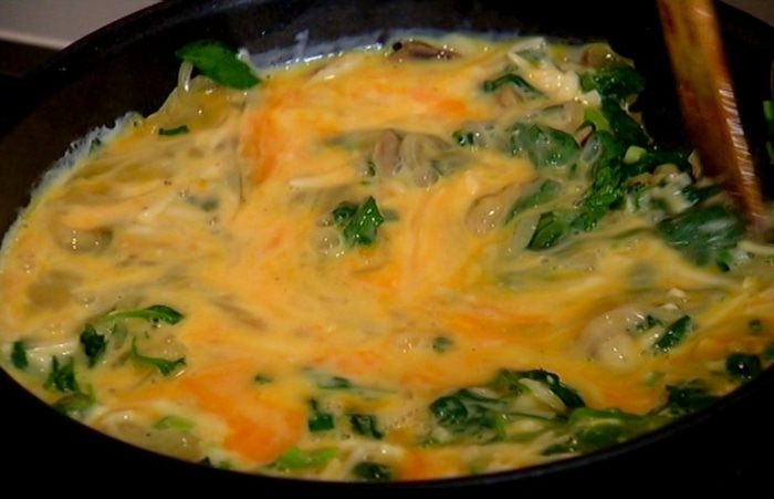Яично-сырную массу вылить в сковороду с грибами и шпинатом.