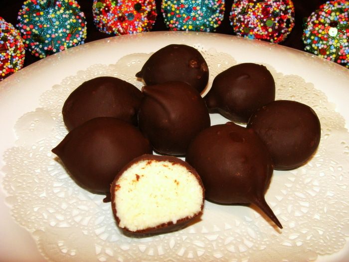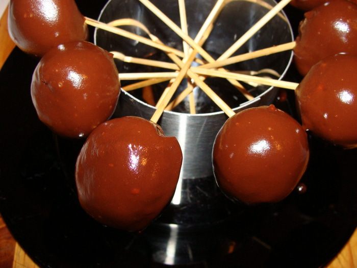 В это время растопить на водяной бане шоколад, можно добавить кусочек сливочного масла (50 г). Шарики нанизать на шпажки, обмакнуть в шоколад, поставить стекать. Как только все шарики окажутся в шоколаде, убрать конструкцию полностью в морозилку еще на 15 минут. Хранить конфетки в холодильнике.