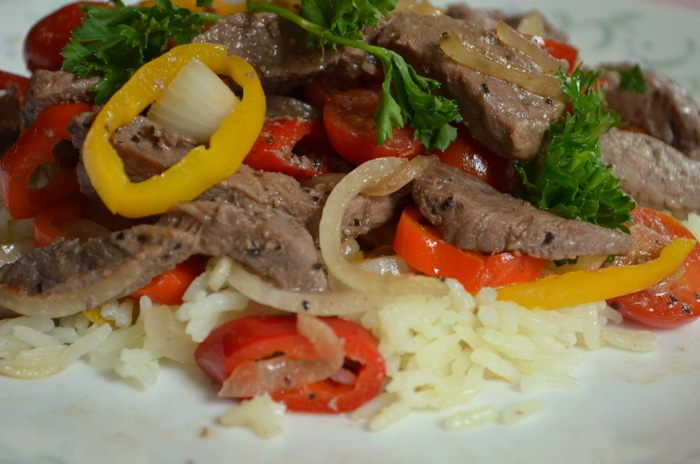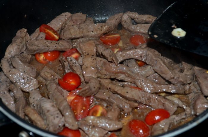 На горячую сковороду с растит.маслом также выложить говядину и обжаривать до готовности или до средней прожарки. Вернем перцы с луком, выложим томаты черри, зелень,соевый соус, кунжутное масло. Все перемешаем 1 мин.