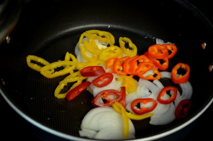 Обжарить на горячей сковороде с растит.маслом лук и перец. Примерно 1-2 мин. Переложить на тарелку и прикрыть фольгой.
