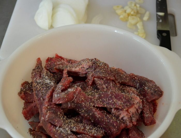 Говядину нарезать полосками. Посолить и поперчить говядину. Нарезать лук и чеснок. Перец сладкий полосками. У меня перец сладкий мелкий.
