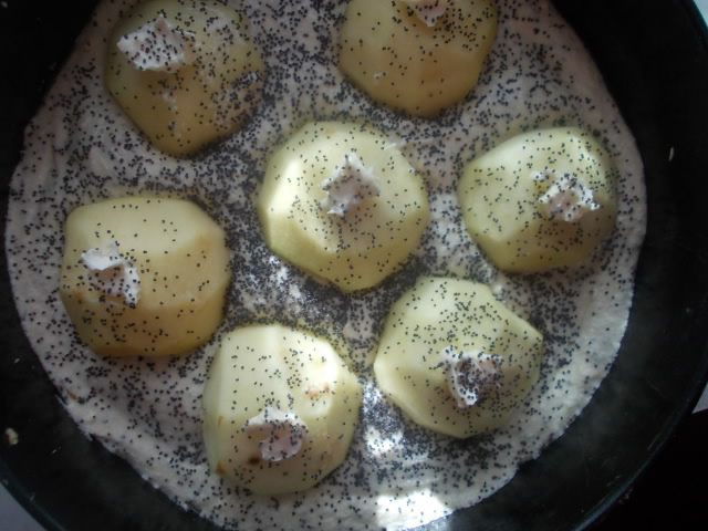 Выложить сверху яблочки и на каждый кусочек положить по капельке сливочного масла. Присыпать слегка маком. Поставить в разогретую духовку 180°С на 35-40 минут.