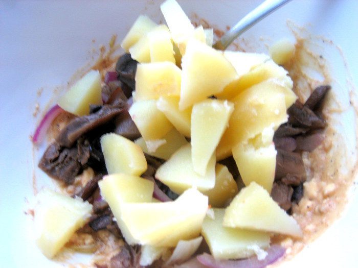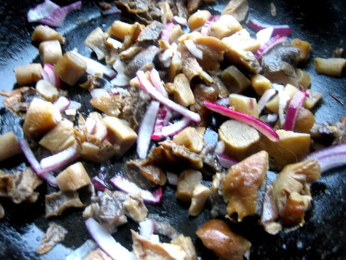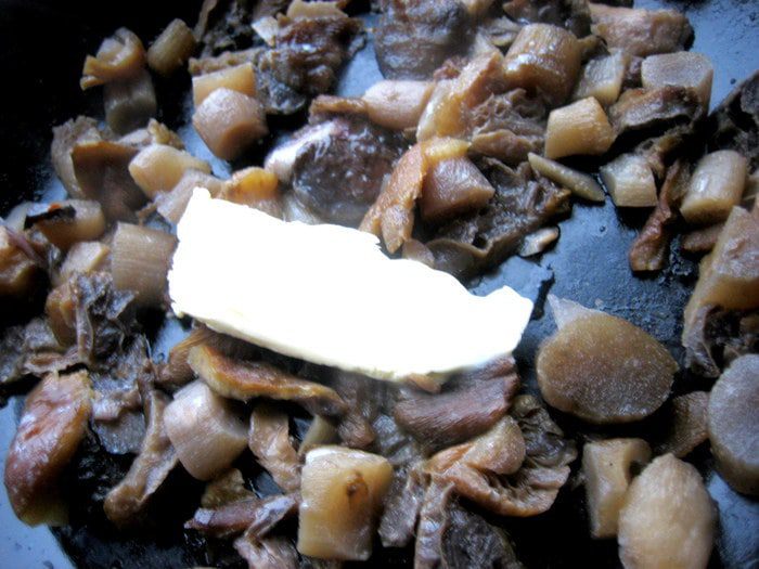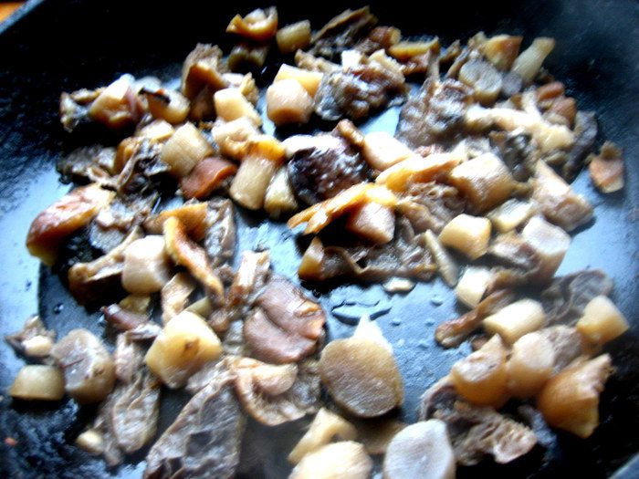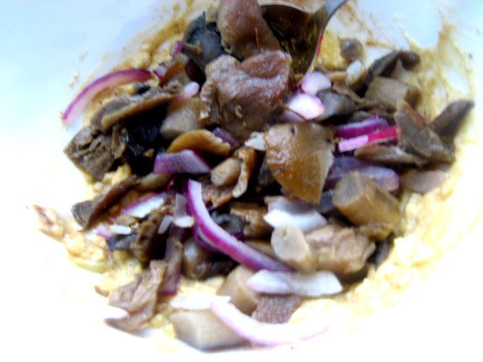 Грибы заранее разморозить... Я замораживаю так: отвариваю кусочками и раскладываю по пиалкам, застеленным пакетиками, а когда остынут, замораживаю прямо в пиалках, затем вынимаю пакет с грибами, завязываю и так получаю порцию грибов, которая быстро разморозится!