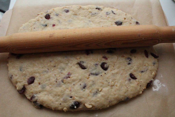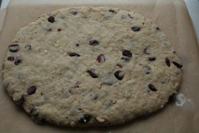 Выложить тесто на присыпанный мукой лист пергамента и сформировать овальную лепешку.