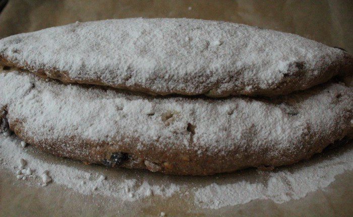 А дальше, как обычно... Обильно смазать растопленным сливочным маслом и обильно обсыпать сахарной пудрой!!! Охладить, завернуть в пергамент и хранить в холодном месте до Рождества.