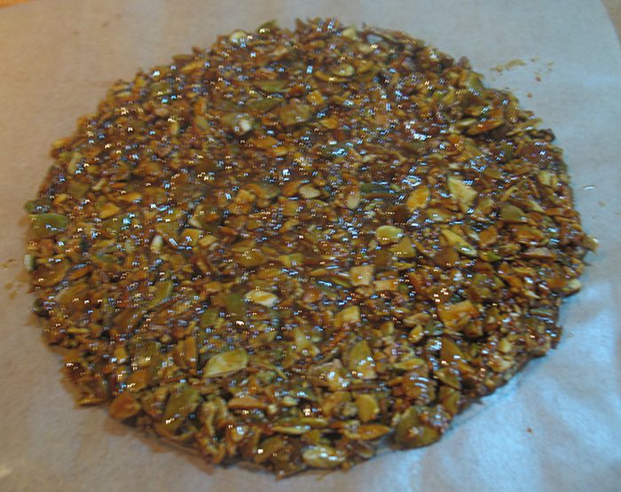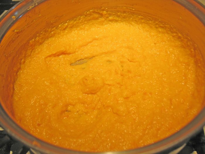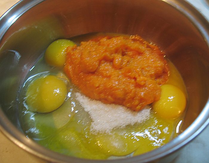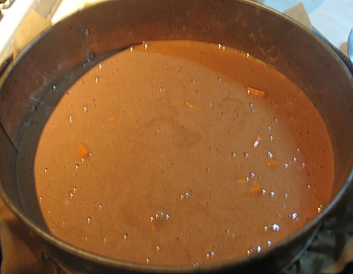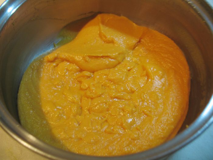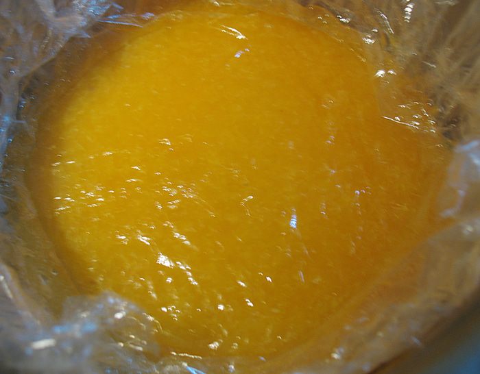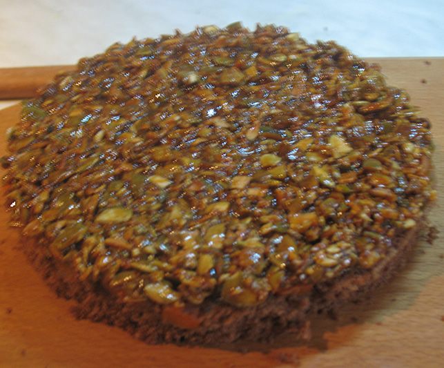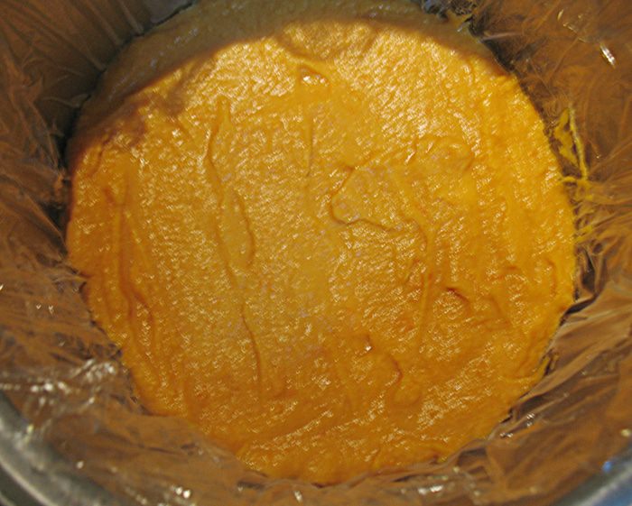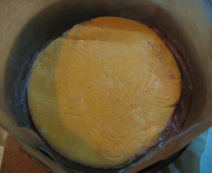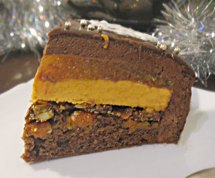 Достаем из морозилки тыквенный креме с мандариновым джемом. И джемом в низ выкладываем его на мусс, слегка вдавливая. Добавляем шоколадный мусс. Сверху кладем бисквит с пралине, вдавливаем слегка и добавляем мусс. Отправляем в морозилку минимум часа на два, но можно и дольше.