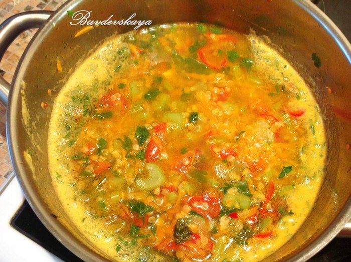 Влить 8 стаканов питьевой воды и довести до кипения. Накрыть крышкой и варить на минимальном огне 1 час 45 минут до образования пюре. Пюрировать суп блендером. Суп должен быть достаточно густым, но по желанию его можно немного разбавить водой. Перелить обратно в кастрюлю. Посолить, поперчить. Добавить лимонный сок, тщательно перемешать. Подавать в подогретых тарелках с вкусным хлебом ! ENJOY !