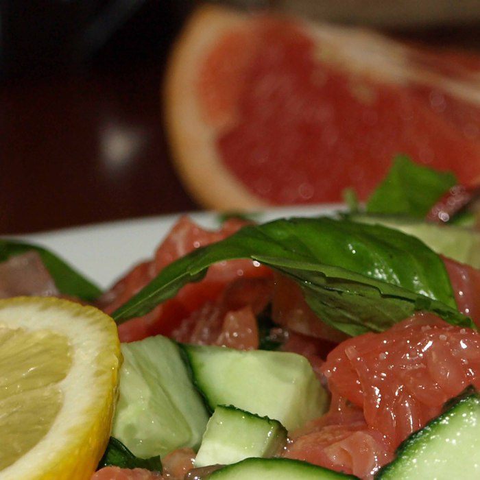 Грейпфрут очищаем от пленки, режем кубиками. Помидоры черри режем пополам, огурцы — произвольно, базилик рвем руками (оставляем пару листиков на украшения). Семгу режем кубиками. Все соединяем. Добавляем оливковое масло, сок лимона, соль — по вкусу.