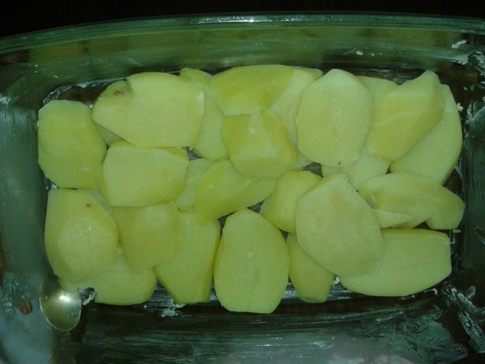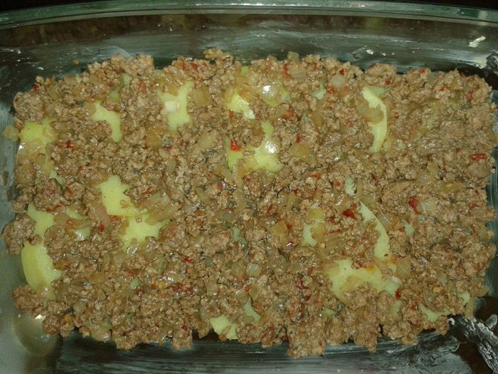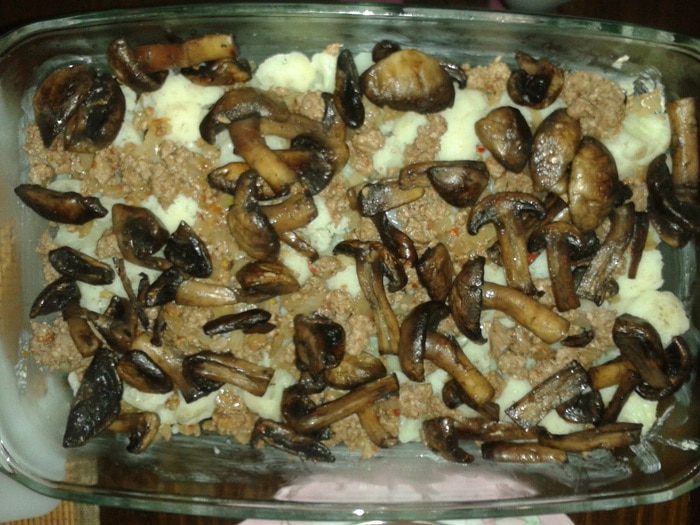 И последний слой - грибочки (предварительно обжаренные у меня). Сверху все это присыпаем сыром, и я в этом случае заливала взбитыми яйцами (чтоб было быстрей), а можно сделать бешамель - будет еще вкусней, и в духовку минут на 30-40. На первые минут 20 закрывала блюдо фольгой, а потом без, до появления корочки.