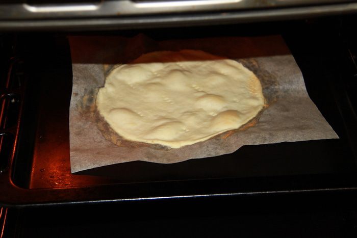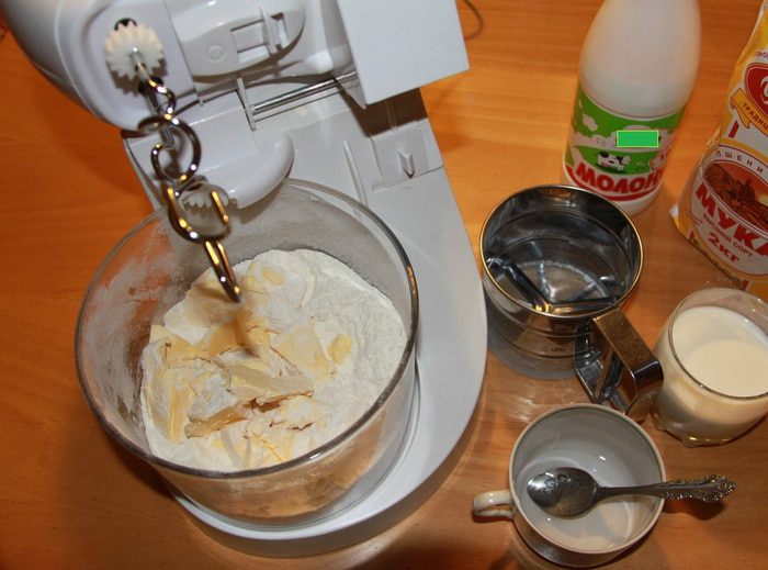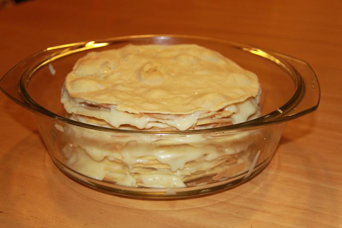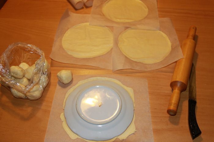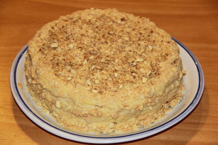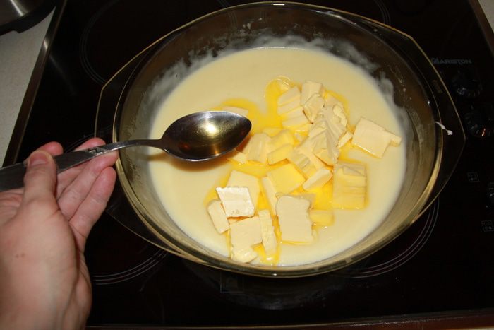 Пока тесто приходит в себя в холодильнике, сварить заварной крем из 3 яиц, 1 стакана сахара, пол-литра молока и 2 ст.л. муки. Остудить и добавить 70 г сливочного масла и 1 ст.л. коньяка или ликёра. Крем взбить и убрать в холодильник, прикрыв плёнкой, чтобы не образовалась корка на поверхности крема. (Подробнее, как варить заварной крем смотрите здесь: http://www.edimdoma.ru/retsepty/59010-rulet-italyanskaya-koshka)