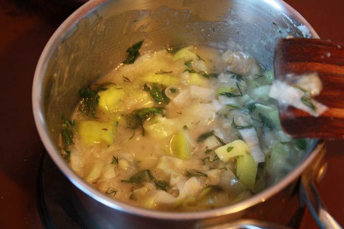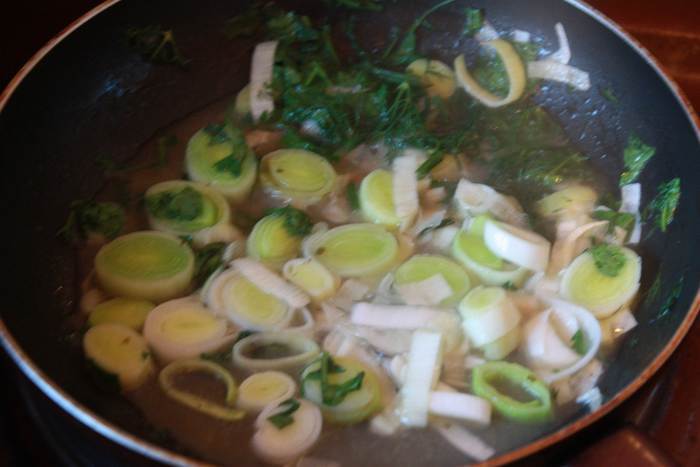 Лук и зелень порежем и потушим недолго на смеси сливочного и растительного масла,вольем вино и поварим 5 минут.