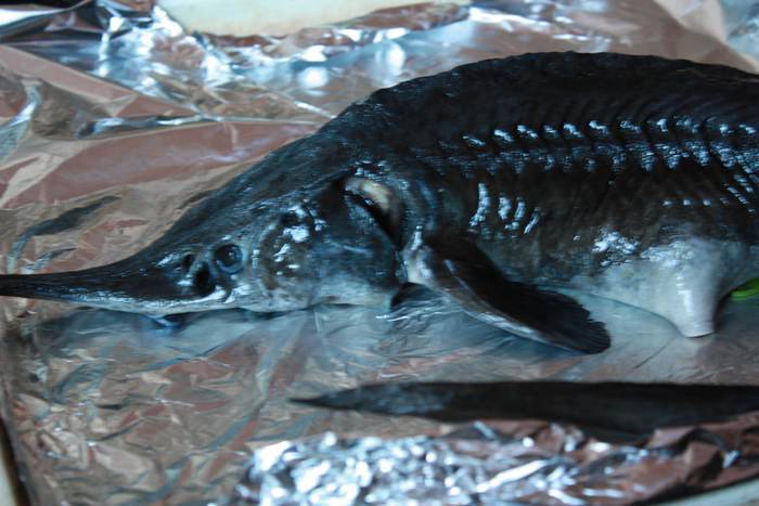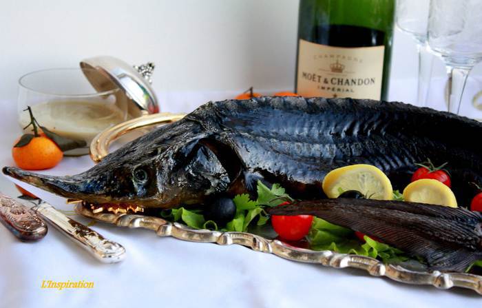 В завершении конкурса хочется показать красивый и изысканный рецепт,который займет поистине достойное и главное место на столе в Новогоднюю ночь. Ведь именно в подготовке к этой ночи мы ищем все самое лучшее! Это конечно,не дикий осетр весом 15-20 кг,а скорее осетренок)) немного побольше стерляди! В поисках рецептах, я сразу отвергла различные виды фаршировки ее картошкой,морковкой и т.д. Да простите вы меня, лично я считаю, что это только портит эту рыбу, чье мясо считается "царским". Ведь оно необычайно полезно,кладезь аминокислот и витаминов. В общем, я решила эту рыбку запечь довольно просто, ничем не перебивая вкус, чтобы получить истинное удовольствие от дегустации. Единственное, приготовила соус для этой рыбы, на желание гостей)) Рыба сама по себе жирная,поэтому к ней идут различные "кислые" соусы.