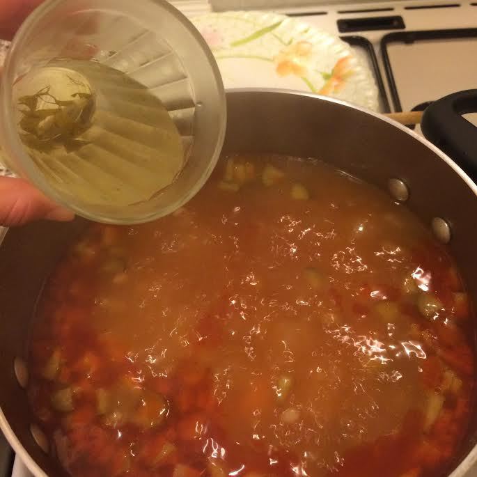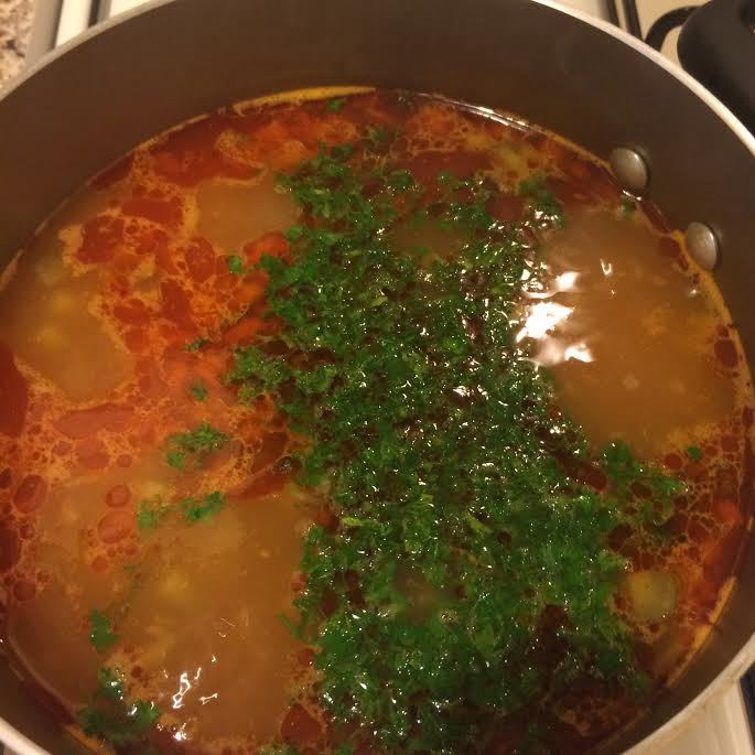 Перловку отварить, промыть и добавить в бульон. Варить 10 минут. (Перловка варится долго, поэтому ее лучше отварить заранее).