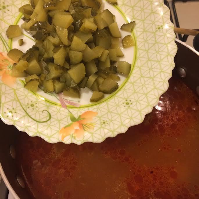 Огруцы мелко нарезать. В бульон добавить огурцы, мясо и варить 5 минут.