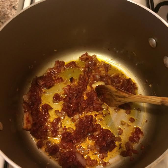 Лук, чеснок мелко нарезать, потушить, добавить томатную пасту и перемешать.