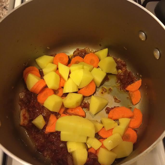 Затем добавить картофель, морковь, перемешать и тушить 1 — 2 минуты.