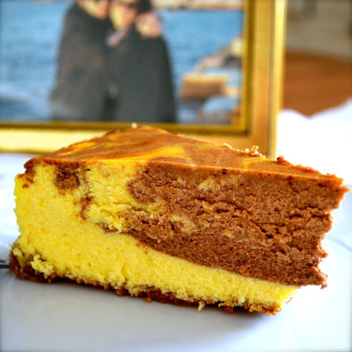 Выпекать чизкейк при температуре 220 С 10 минут, затем уменьшить температуру до 140 С и продолжать выпекать еще 1 час. Готовый торт полностью остудить (желательно 1 ночь в холодильнике) и удалить стенки формы уже перед подачей на стол... Сверху по рецепту предлагалось выложить начинку из вишни! )))) Здесь я такую, к сожалению найти не могу! (((