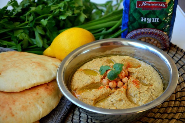 Хумус — это холодная закуска из нутового пюре и специй. В состав хумуса обязательно входит кунжутная паста (тахини). Подают хумус с овощами, зеленью и лепешками пита.
