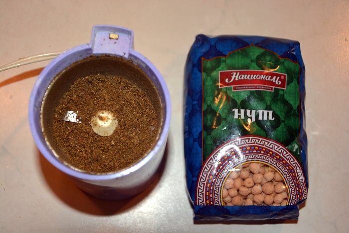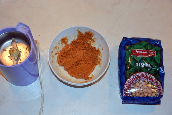 И перемолоть в кофемолке. Переложить в миску и добавить 1 ч. л. оливкового масла, растереть. Должна получится кашица, это и есть тахини или кунжутная паста. Она придает хумусу приятный ореховый вкус.