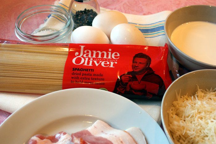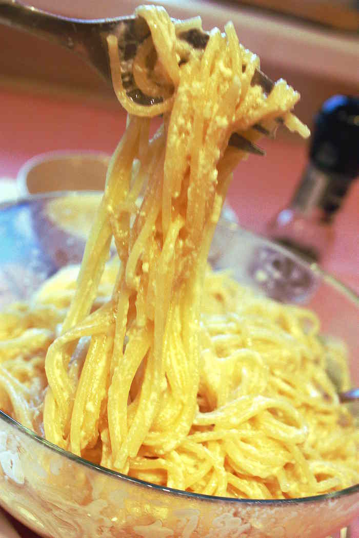 Приготовленные спагетти опрокинуть на дуршлаг ненадолго, чтобы осталось немного влаги. Затем очень быстро перенести спагетти к смеси из яиц, сыра, молока со сливками. Добавить бекон, поперчить и все аккуратно перемешать.