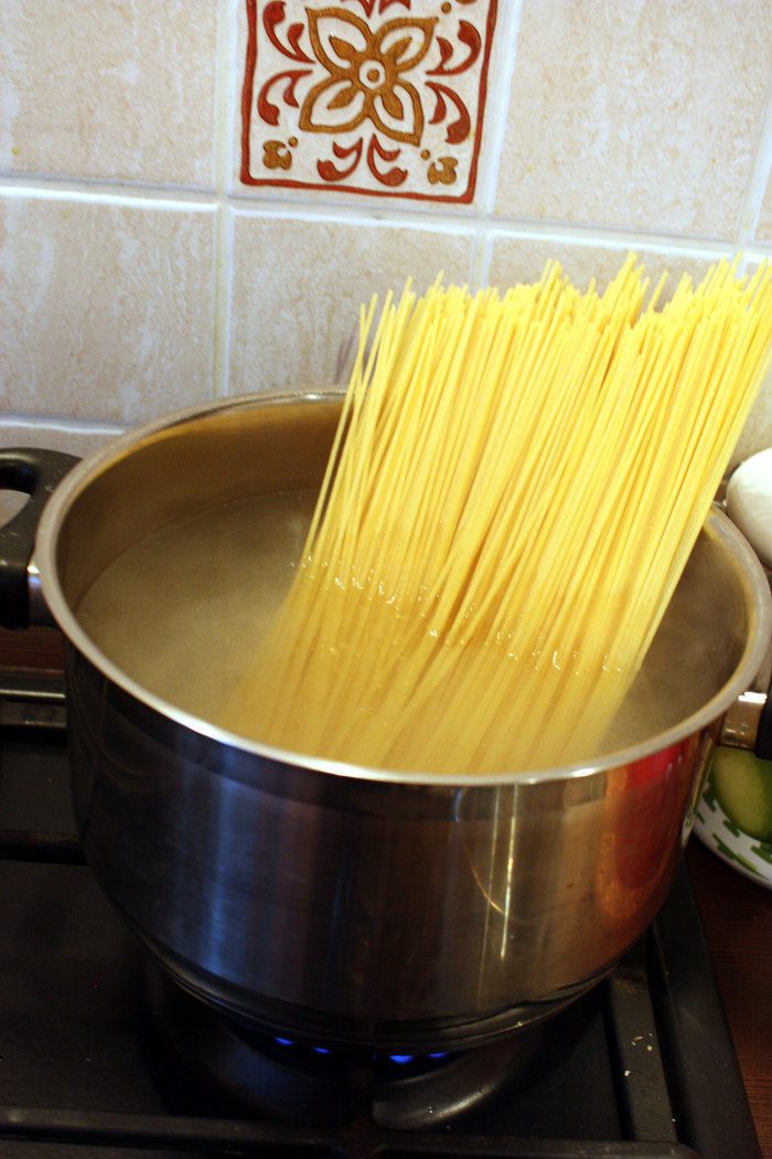 Посолить воду и после закипания положить спагетти в кастрюлю. Варить согласно инструкции на упаковке (около 8 минут, до состояния "al dente").
