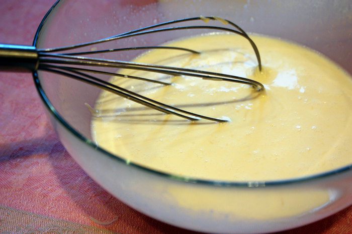 В большой миске взбить яйца, добавить тертый Пармезан, молоко со сливками.