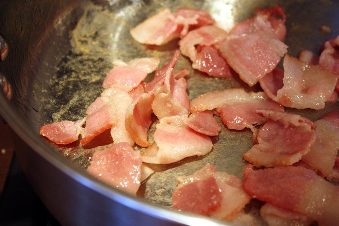 Тем временем в большой сковороде жарить ломтики бекона на среднем огне, периодически помешивая, до состояния золотистой корочки либо около того.