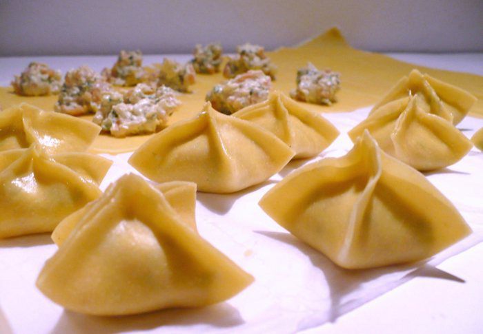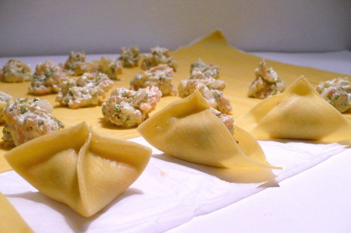Достать макаронное тесто из холодильника. Мягкий сливочный сыр смешать с небольшим количество лимонного сока, лосося нарезать мелкими кусочками, мелко нарубить 1 мелкую луковицу, смешать всё с сыром. Посолить, поперчить, добавить песто, мелко нарубленную петрушку и зелёный лук.