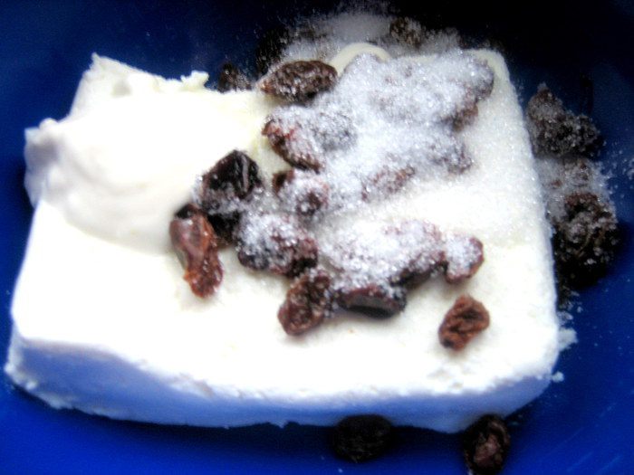 Для начинки творог смешиваем с сахаром, сметаной и изюмом.