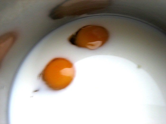 В тёплое молоко вбить пару яиц крупных.