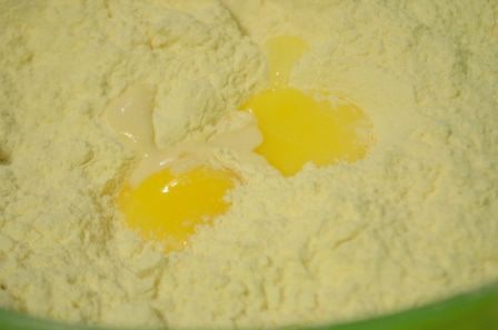 Добавить 100 г сахара, соль, желтки, 150 мл молока и очень мягкое сливочное масло.