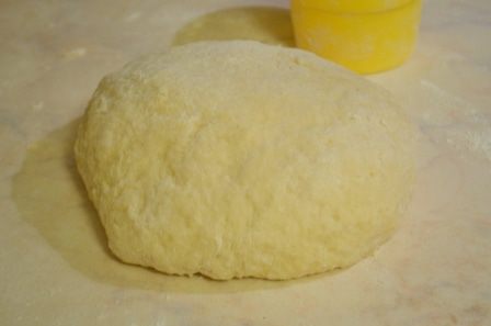 Достаем тесто и замешиваем его на столе в оставшейся муке. Вымесить как следует, чтобы оно стало мягким и не липким. Мука может еще понадобится, а может и нет).