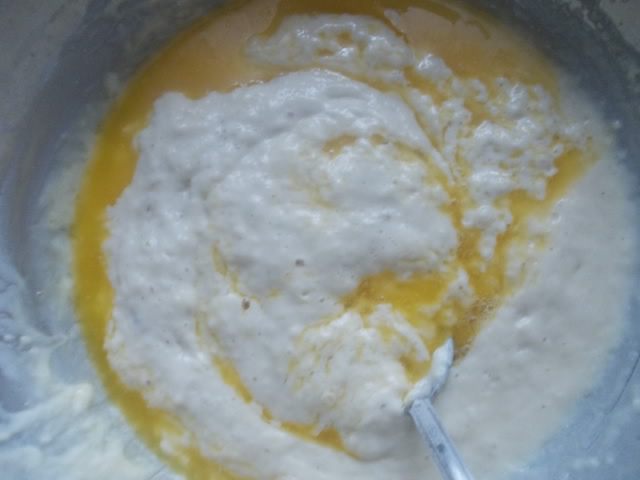 Затем влить в опару,предварительно растопленное масло, сахар и остальную муку. Замесить эластичное,не сильно крутое тесто.
