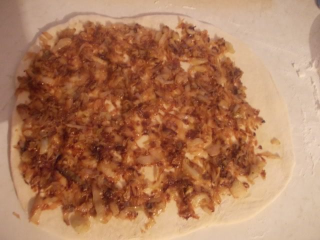 Когда тесто подойдет,хорошенько его помять(подсыпать муки) и раскатать в квадрат,толщиной около 1 см. Предварительно потушить капусту с луком на растительном масле,добавить соль и специи по вкусу. Укладываем остывшую начинку,на пласт теста.