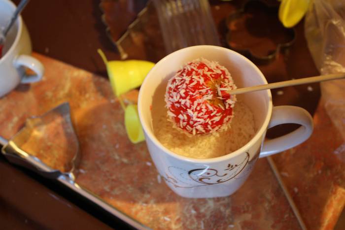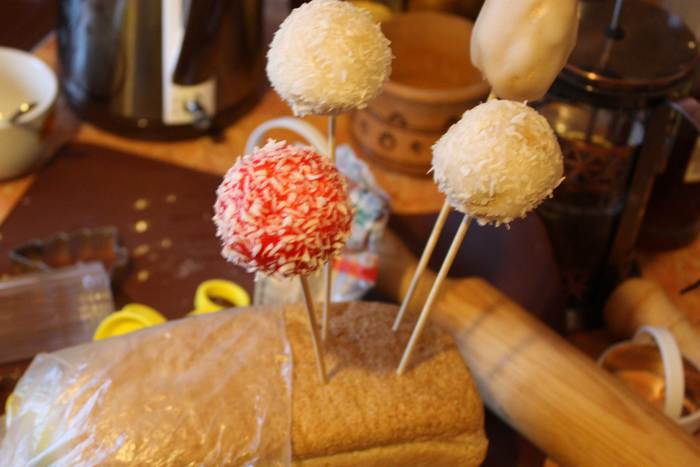 Начинаем варить глазурь, для этого нагреваем сливочное масло со сливками, но не кипятим!!, добавляем порубленный белый шоколад и мешаем до однородности. Даем чуть остыть. В каждый пряник втыкаем палочку, обмакиваем в глазурь, или поливаем ею и украшаем на Ваш вкус!!