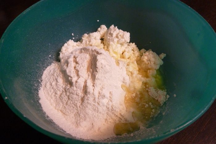 Сливочное масло растопить в микроволновке. Просеять муку. Смешать вместе сыпучие продукты. Сахар не сыпать! Добавить творог и растопленное сливочное масло.