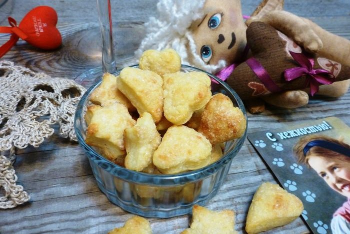 Вырезаем формой фигурки (сердечки, звездочки и др). Сахар насыпаем в плоскую тарелку и каждую фигурку обмакиваем в сахар,как бы вдавливая его в тесто. Выпекаем в духовке при 190°С минут 20 до золотистого цвета.