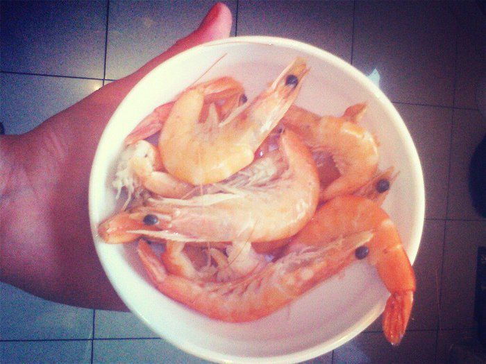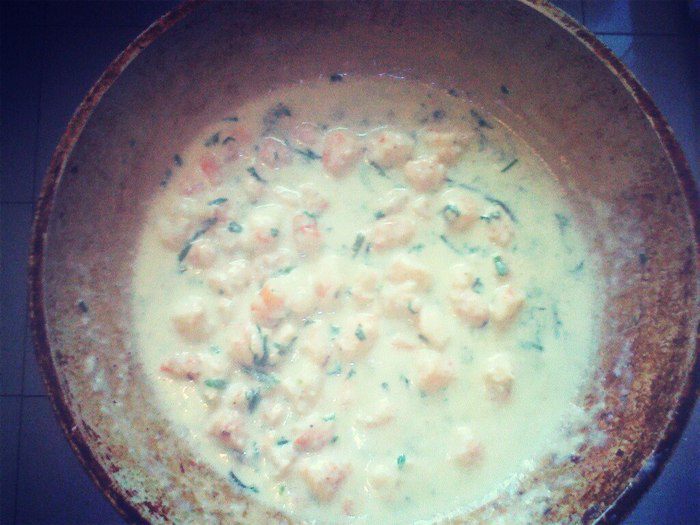 Сливочное масло растопить. Добавить креветки. Жарить 2 минуты. Добавить сливки, а в конец зелень. Смешать соус с 2 яйцами.