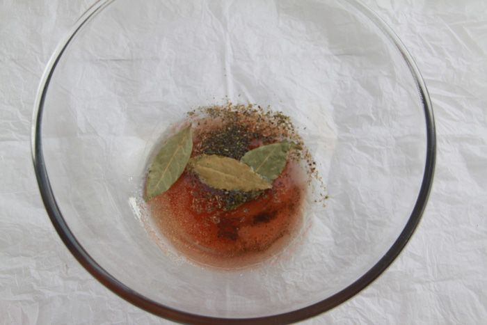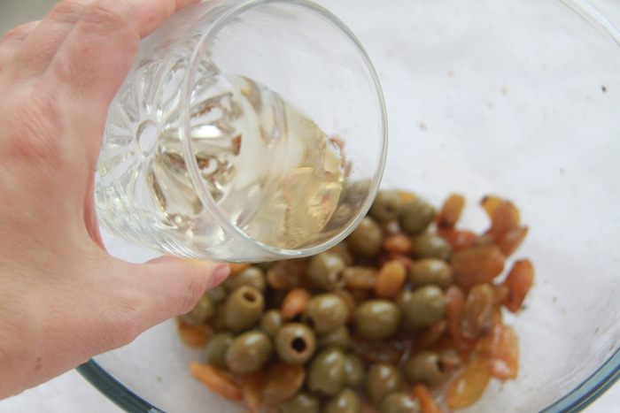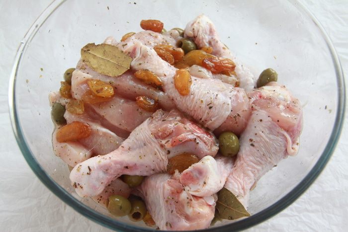 Через указанное время вынуть курицу и выложить мясо в форму для запекания (у меня керамическая овальная объёмом 2,5 литра). В маринад добавить белое вино, перемешать.