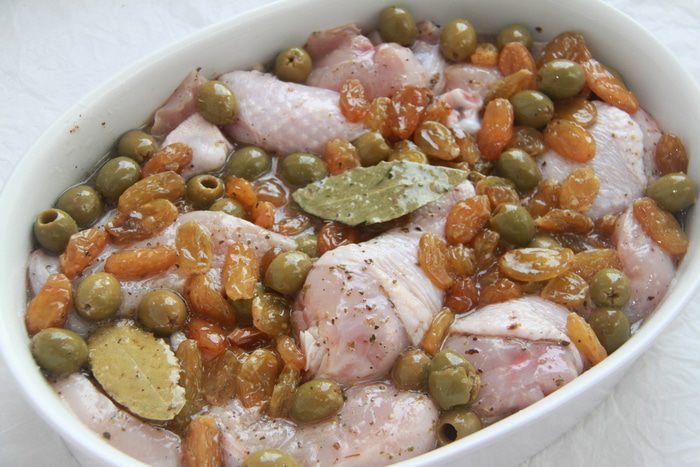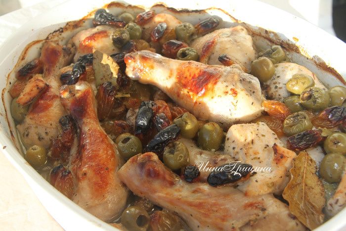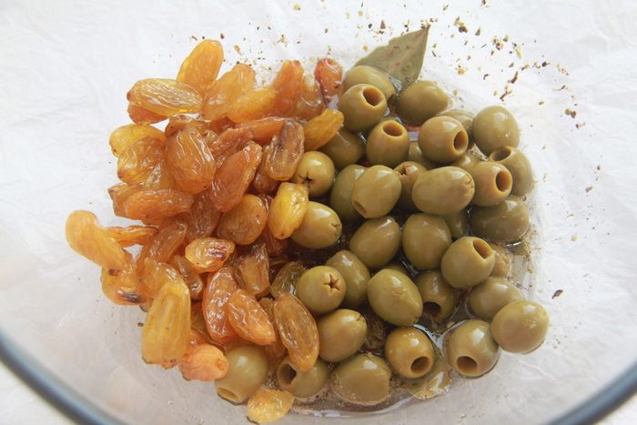 Запекать при 180*С 50 минут. После 30 минут запекания прикрыть сверху фольгой, чтобы изюм и оливки не пригорели.