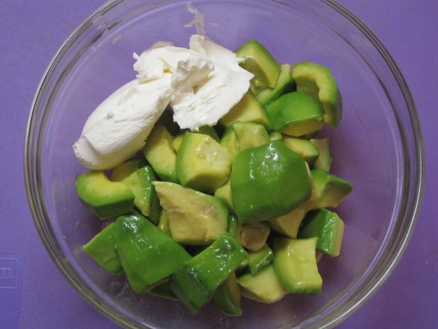 Мякоть авокадо с творожным кремом поместить в блендер.
